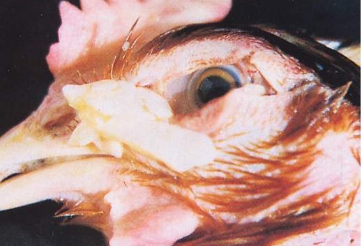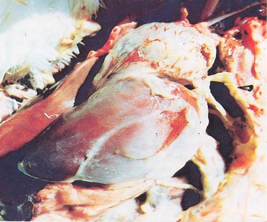 临床特点:23-33天开始,张口呼吸(蛤蟆叫声); 夏季 40天后狂叫而死亡。剖检特点:单侧肺脏纤维素化----气囊炎---心包炎—心包积水----肝周纤维素包裹支原体: 气管渗出黏液---气囊炎--心包炎---肝周炎治疗特点:常规防治呼吸道病抗菌素治疗无效。