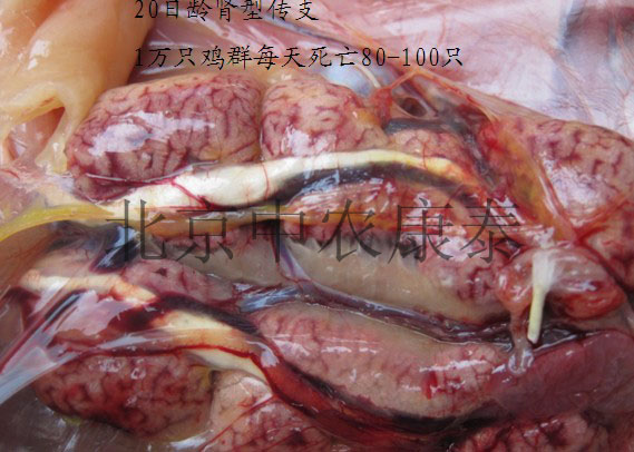 1.发病前5天拉水样稀便,发病后7天出现大肠杆菌,死亡开始增加,每天死亡10-30只/1000肉鸡。
