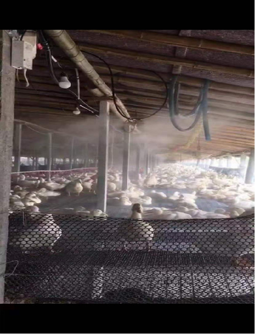 3、喷雾降温:在鸡舍内部可以采用喷雾降温的措施,在喷雾时最好能够加一些可以带鸡鸭鹅等消毒的消毒液,这样不仅能够减低鸡舍内部的温度同时还能起到消毒减少舍内病原微生物数量,净化空气的作用和减少粉尘。