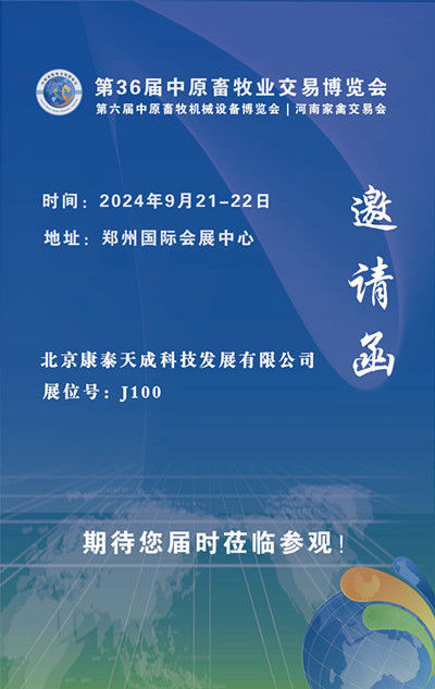 我司将于2024年9月21日—9月22日,在郑州国际展览中心第36届中原畜牧业交易展览会上参展,我们诚挚地邀请您出席此次盛会!我司展位在展馆J100展位。欢迎您莅临参观!