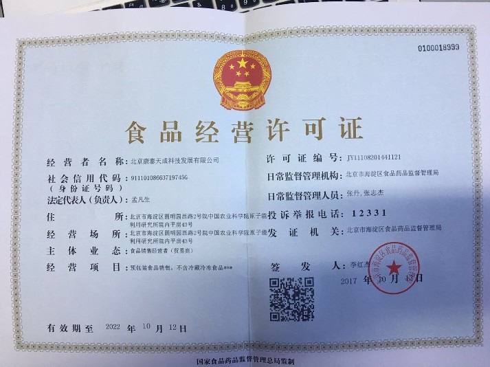 我公司为调整丰富产业结构,于2017年10月取得的食品经营许可证。这也意味着公司吹响向人类保健食品的研发和销售进军的号角。
