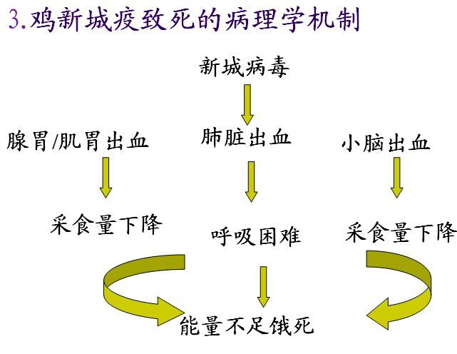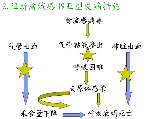 预防: 免疫疫苗后,仍有20-30%发病,但死亡率降低.免疫后抗体高低与发病关系不明显。因此,不提倡免疫.治疗 发病前4天:重点—控制禽流感病毒扩散;